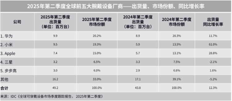 IDC最新发布的2025年第二季度民众腕戴树立阛阓文告明白,在全体阛阓12.3%的同比增长态势中,华为以990万台出货量、20.2%的阛阓份额蝉联民众榜首,出货量同比增幅达11.7%,在头部厂商中展现出极强的阛阓韧性,而其在中国阛阓统一6年出货量第一的成绩,更印证了品牌扎根原土的深厚积淀。