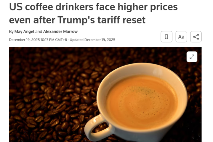 路透社日前报谈称,尽管好意思国政府11月回调部分食物入口关税,但好意思国阔绰者短期内仍难以看到咖啡价钱彰着着落。