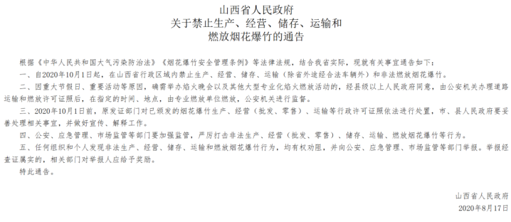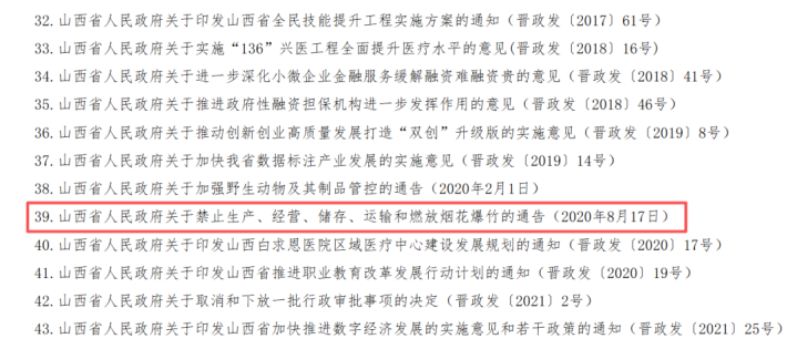 在公布的文献目次中,2020年8月17日发布的《山西省对于辞谢出产、考虑、储存、运载和燃放烟花炮竹的晓谕》也被宣布废止。