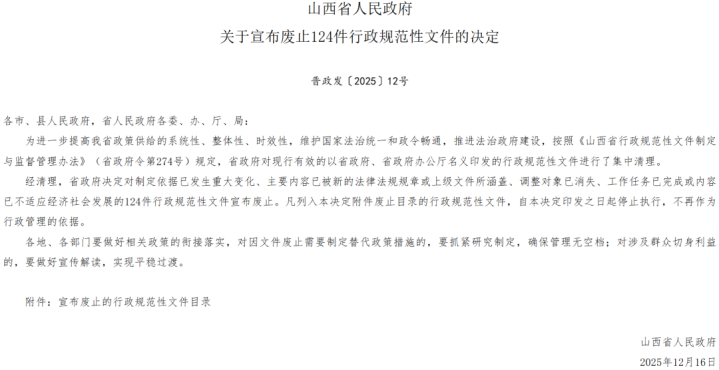 近日,山西省东谈主民政府网发布对于宣布废止124件行政步调性文献的决定,决定暗意,经算帐,省政府决定对制定依据已发生要紧变化、主要内容已被新的法律法例章程或上司文献所涵盖、诊疗对象已祛除、责任任务已完成或内容已不适宜经济社会发展的124件行政步调性文献宣布废止。凡列入本决定附件废止目次的行政步调性文献,自本决定印发之日起罢手实践,不再当作行政处分的依据。