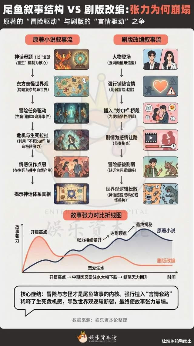 自然,比起“被男凝”的尾鱼女主们,果然让阿水困惑的,其实是尾鱼IP为什么总在改编经由中被推往“言情之路”。尾鱼寰宇的底层结构根本不是神志驱动,而是东方奇诡体系下的冒险驱动,它们齐绕着团结个神话“母题”张开:女主不错新生。