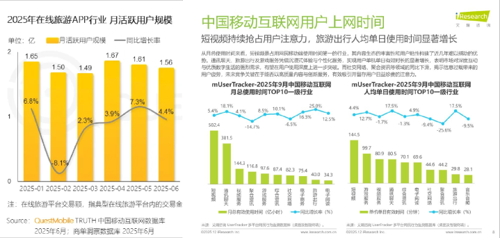 据QuestMobile和艾瑞盘考的数据自大,2025.1-6月,旅游出行的月活用户限度均达到1.5亿以上,旅游出行单日使用期间位列TOP10,同比增速在TOP10中排行第一。用户总量和用户黏性呈现出增速回升且充满韧性的高质料发展阶段。